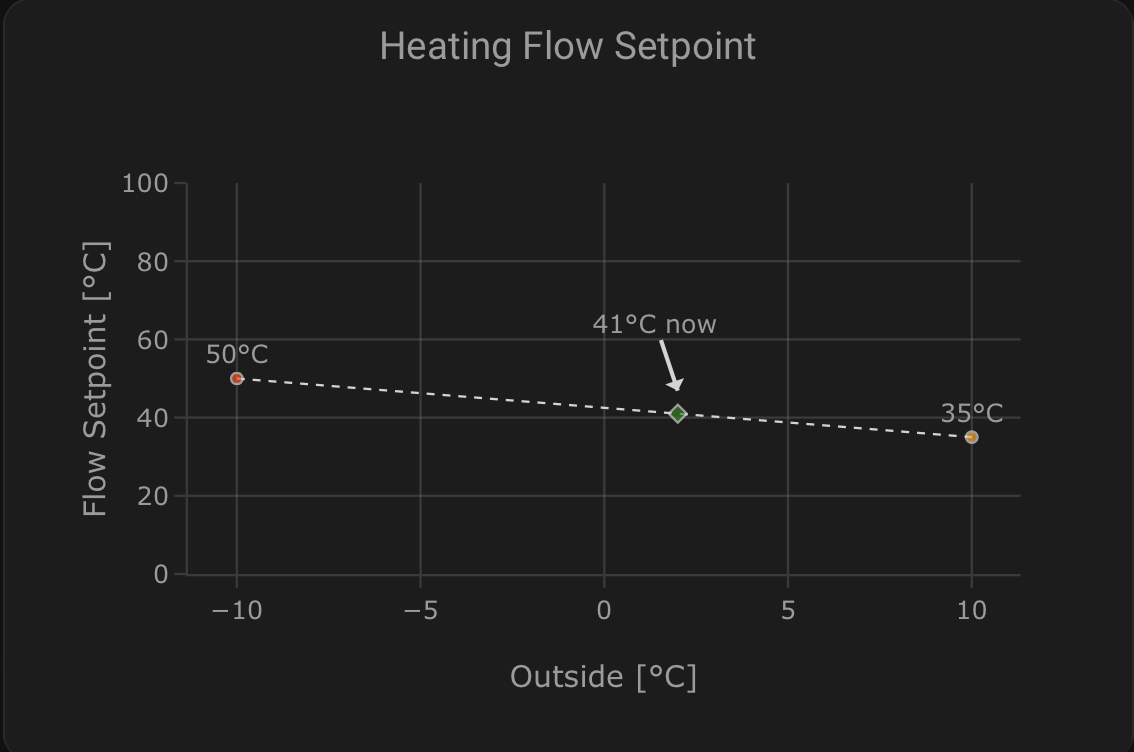 Most HA visualization options for displaying line and scatter plots are designed to display time-based/historic data from HA entities. The plotly-graph card which can be installed via HACS however can be configured in a specific ways to not only use a time-based x-axis. This way we can use entities representing the heating curve lower and upper setpoints, along with the outside temperture and the target flow setpoint to construct a heating curve like shown below.
