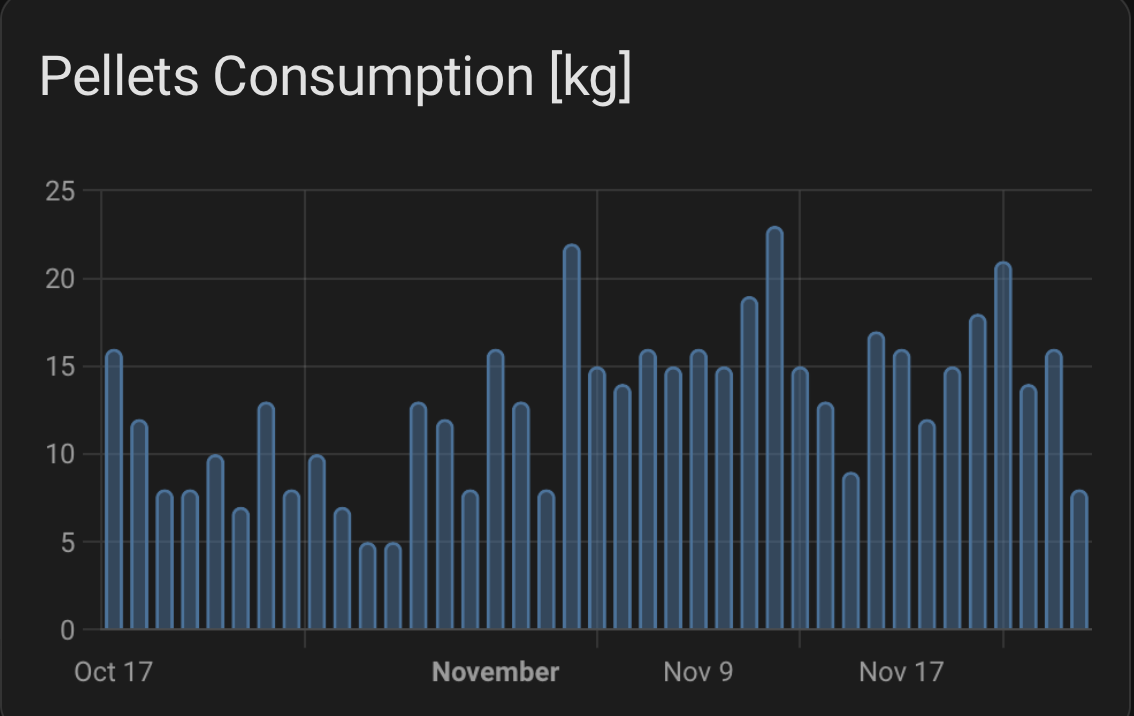 As the HA energy dashboard does not (yet) offer support for something like pellet consumption, since it does not support weight metrics like g/kg etc. we can use a Utility Meter for that purpose. The pellet consumption plot uses the modbus entity modbus_pe1_pellet_consumption_kg in combination with a Utility Meter which can be setup in the Helpers section of HA. The Utility meter enables us to display only the delta of consumption for each day, since the original modbus_pe1_pellet_consumption_kg entity is a total increasing count.