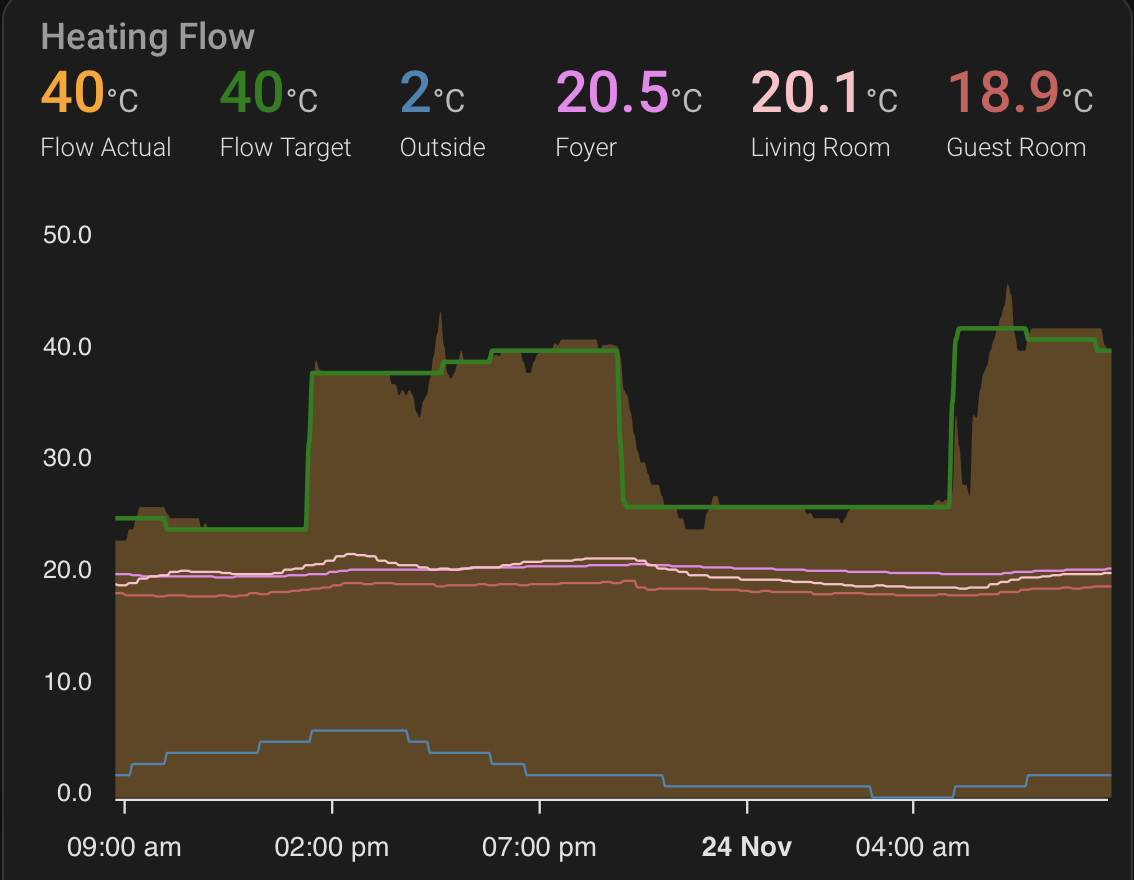 Most HA visualization options for displaying line and scatter plots are designed to display time-based/historic data from HA entities. The plotly-graph card which can be installed via HACS however can be configured in a specific ways to not only use a time-based x-axis. This way we can use entities representing the heating curve lower and upper setpoints, along with the outside temperture and the target flow setpoint to construct a heating curve like shown below.