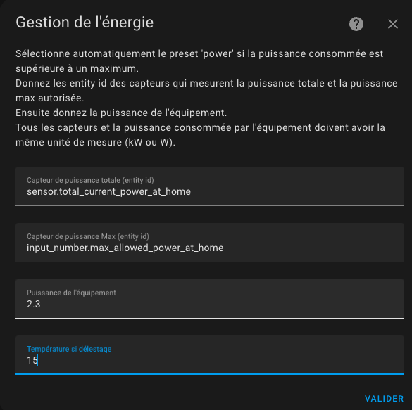 power. This is a hidden preset, you cannot select it manually. 2. I use this to avoid exceeded the limit of my electrical power contract when an electrical vehicle is charging. This makes a kind of auto-regulation. 3. Always keep a margin, because max power can be briefly exceeded while waiting for the next cycle calculation typically or by not regulated equipement. 4. If you don't want to use this feature, just leave the entities id empty